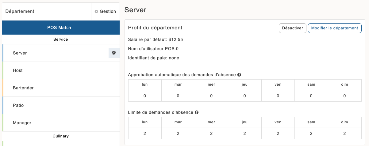 Objectif: Personnaliser les paramètres de chaque département de votre restaurant pour appliquer un salaire par défaut et contrôler le nombre de demandes de congé pour chaque jour de la semaine.