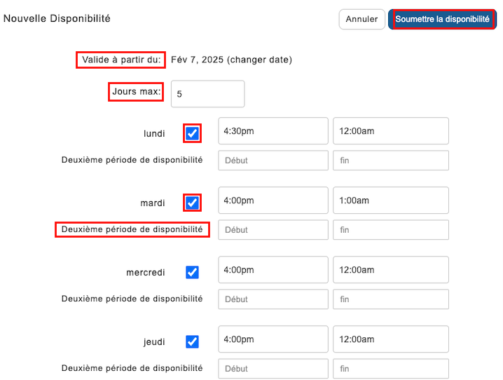 - Cliquez sur le bouton « Soumettre la disponibilité » pour enregistrer.