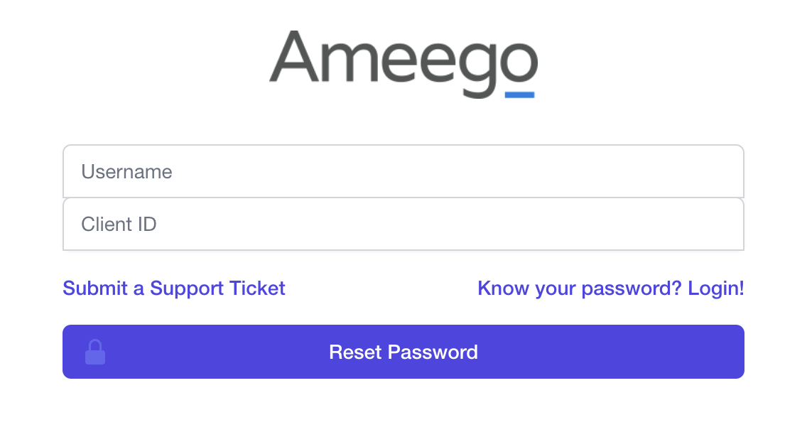 Si vous vous êtes déjà connecté(e) à Ameego, vous pouvez réinitialiser votre mot de passe si vous l'avez oublié en cliquant ICI . Vous devez connaître votre nom d'utilisateur (username), votre identifiant client (Client ID) correspondant à votre lieu de travail, et avoir une adresse courriel valide dans votre profil Ameego pour utiliser cette fonctionnalité.