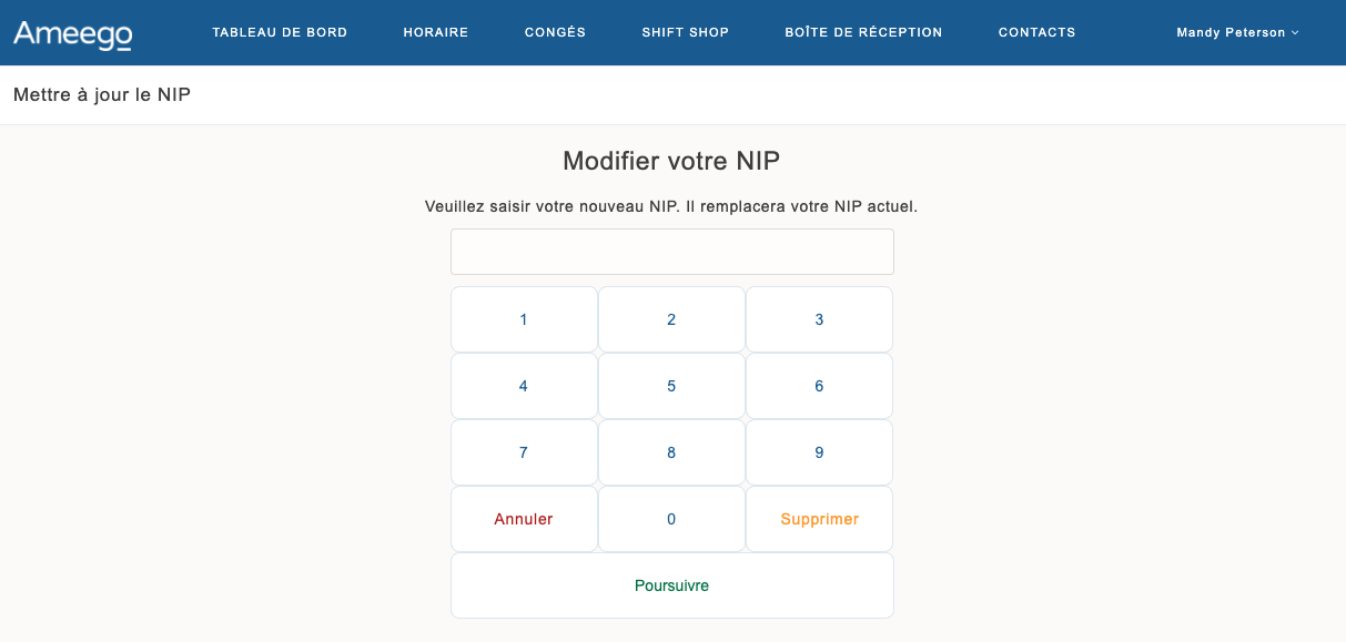 Si votre employeur a choisi d'utiliser la Pointeuse Ameego, un code NIP est requis. Le code ne sera utilisé que pour les fonctions de la pointeuse (pointage d'entrée / sortie) et ne doit pas être confondu avec votre mot de passe de connexion Ameego.